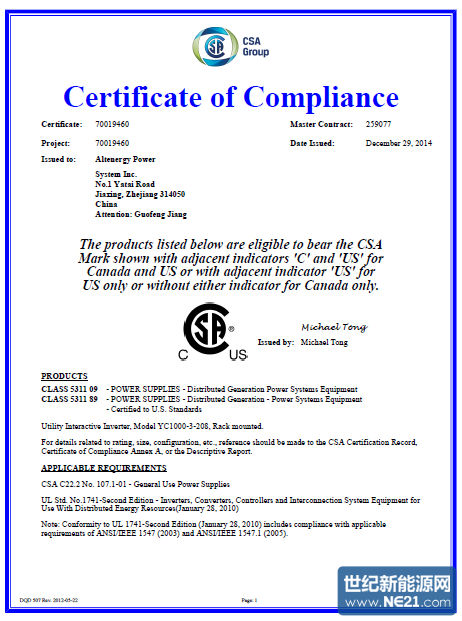 YC1000-3-208通过CSA认证_专业光伏媒体