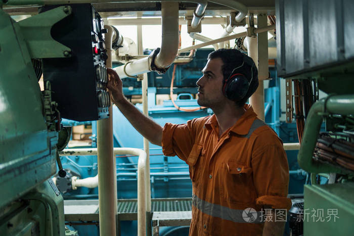 轮机工程师在机舱内工作