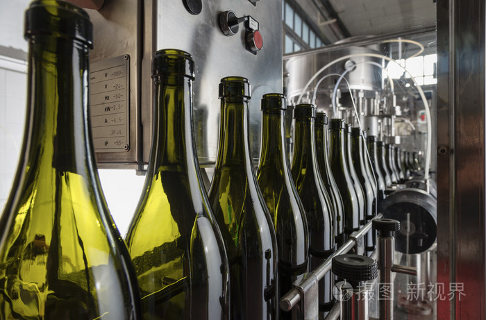 葡萄酒瓶准备洗和充满酒由某葡萄酒厂工