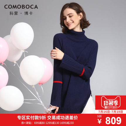 科蒙博卡秋冬新款中长款纯羊绒衫女条纹