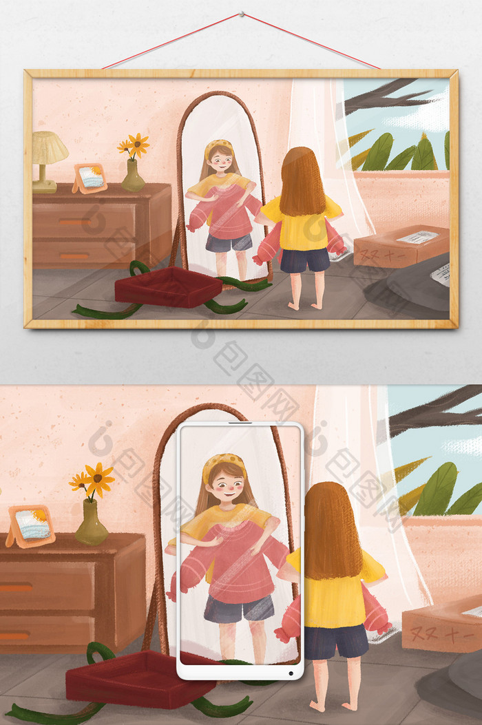 粉色双十一网购拆快递试衣服插画