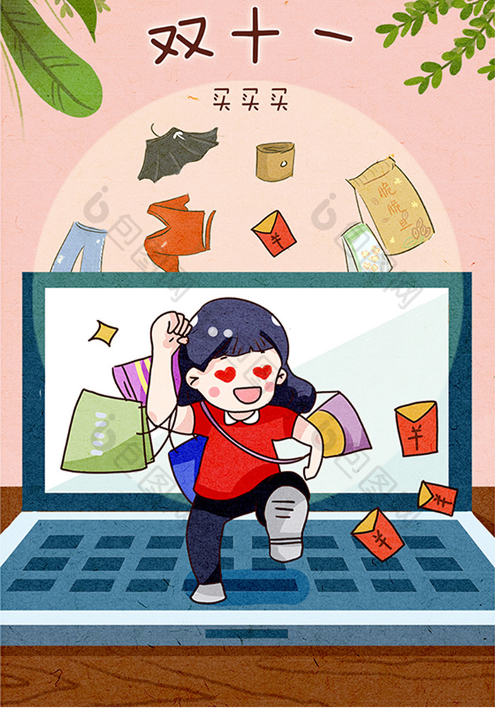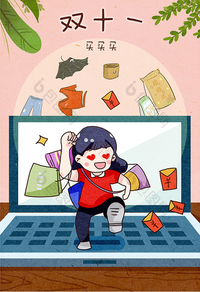 双十一网购女孩奔跑服装食品零食裙子插画