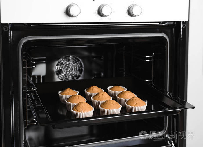 与奶油蛋糕和巧克力在烤箱中的烤盘