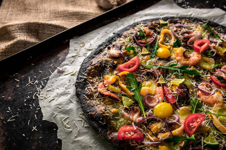 意大利比萨与黑面团和海鲜的烤盘从烤箱