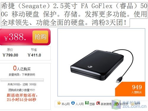 只需399元 希捷500G移动硬盘Z团特价_