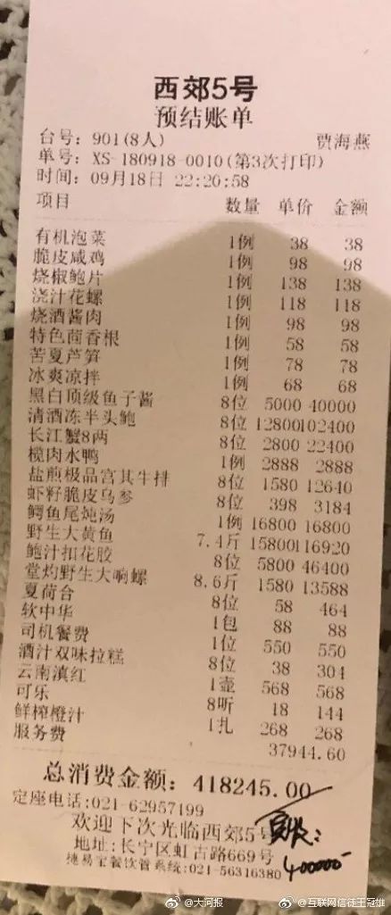 8人一顿饭吃掉40多万元,天价账单疯传!