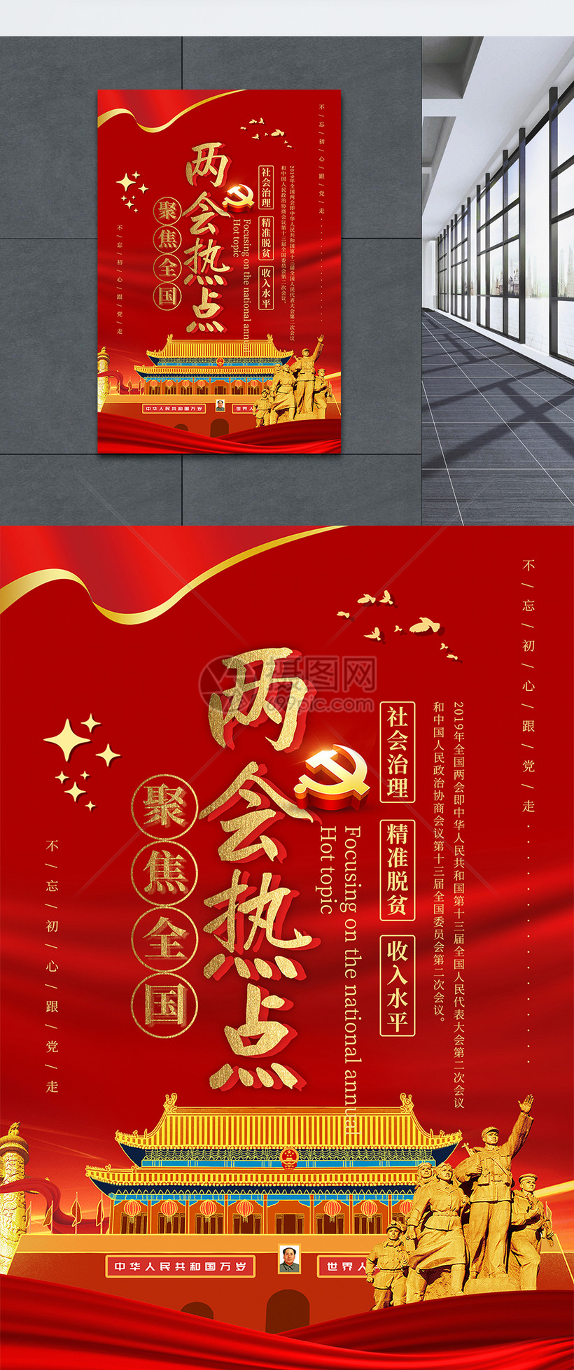红色聚焦两会热点海报