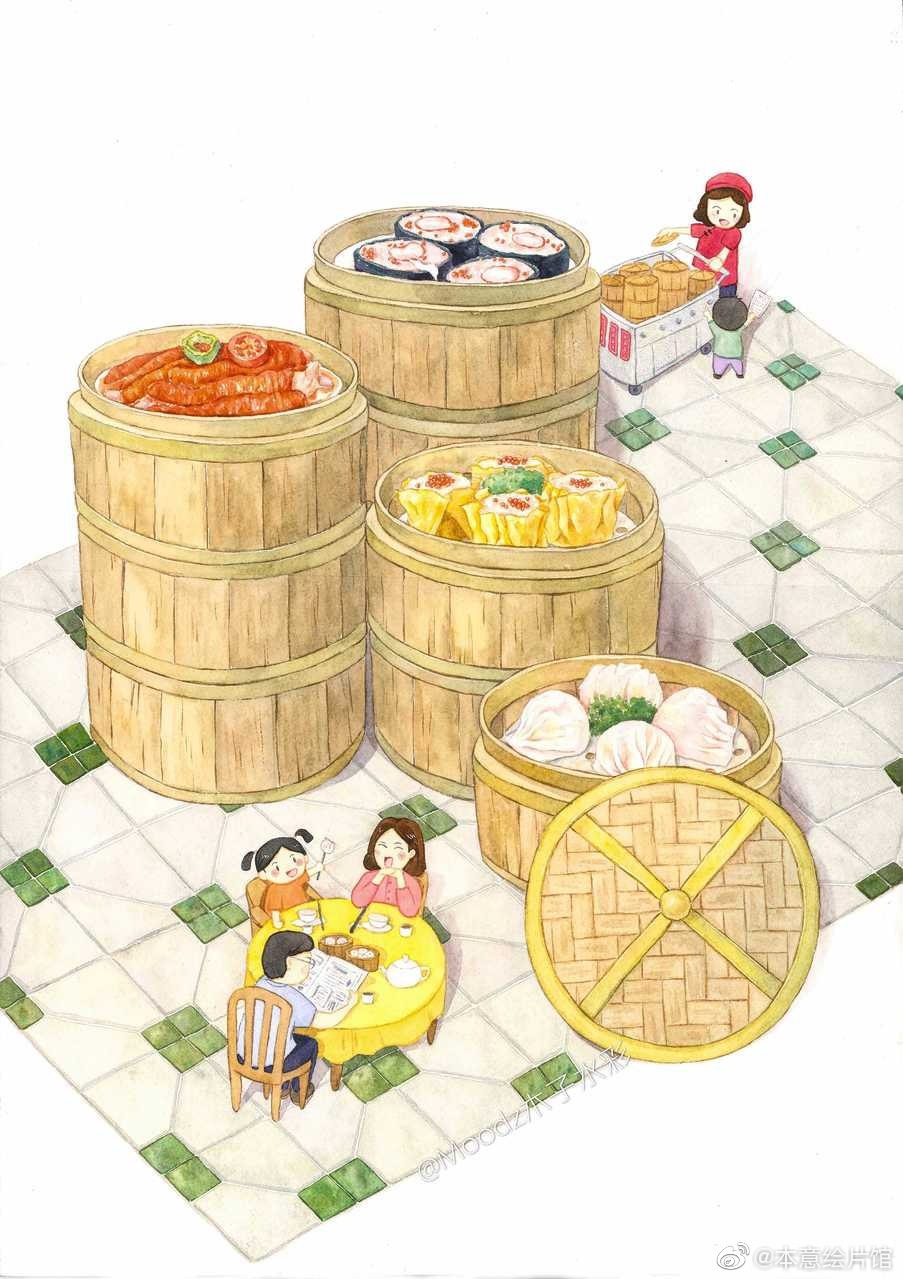和家人一起去茶楼喝早茶 | 绘画:@Moodz木子水彩