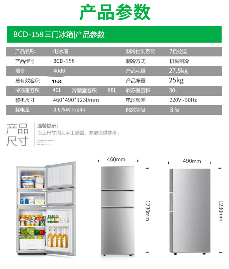 yzjm\/扬佳 BCD-158L冰箱三门家用冷藏冷冻