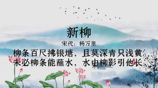 简介:《新柳》是南宋诗人杨万里创作的一首七言绝句。作品原文新柳柳条百尺拂银塘,且莫深青只浅黄。未必柳条能