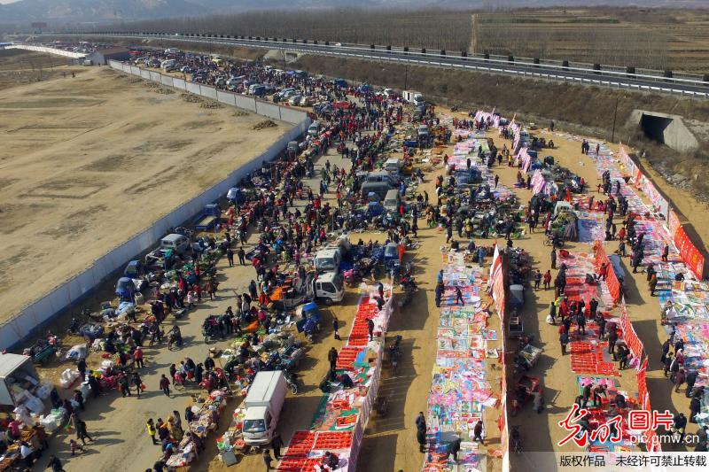 航拍日照农村年货大集 场面壮观似现代版