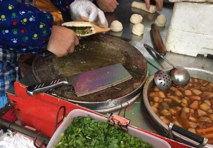 大娘摆摊卖卤肉烧饼,很多人来买的时候