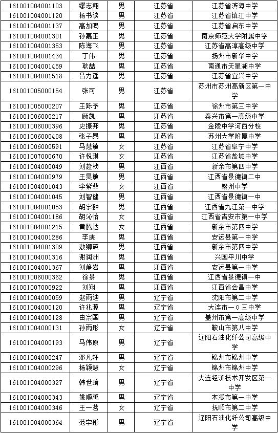 北京化工大学2018年自主招生入选考生名单