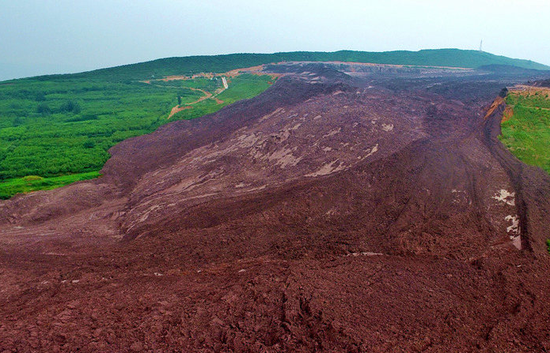 航拍洛阳新安赤泥库滑坡现场 褐色泥土湮没部分民房