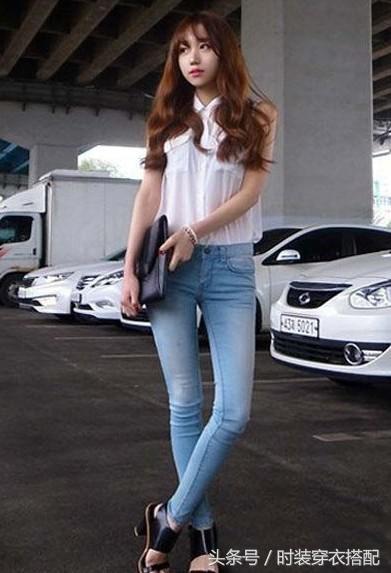 白色上衣搭配浅色牛仔裤,甜美可爱,时尚不