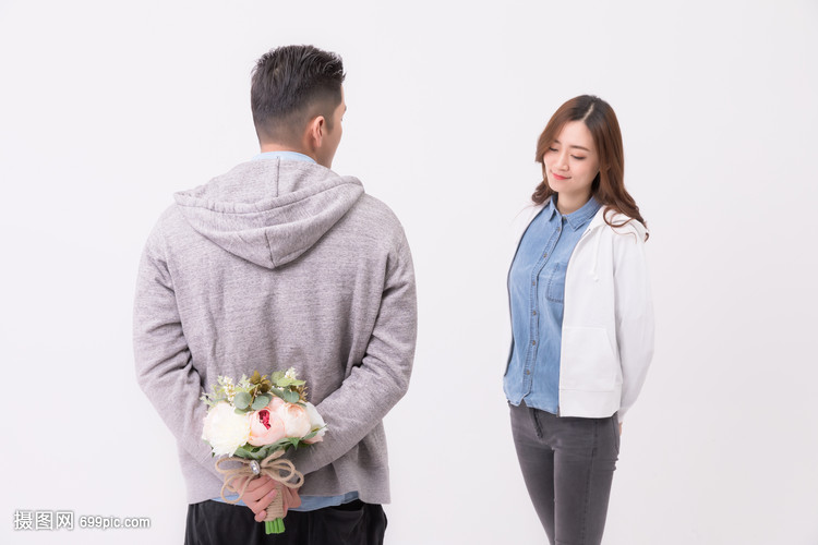 给他女朋友送花的人穿衣服的年轻女人穿着衬衫和裤子的胡子男人情侣情侣。平面矢量设计