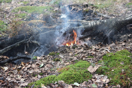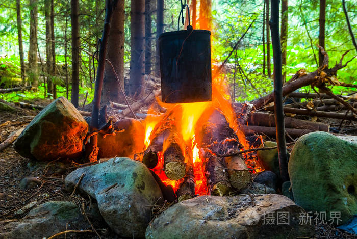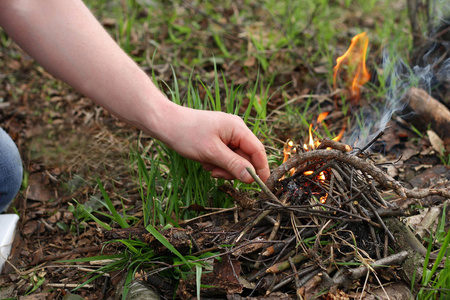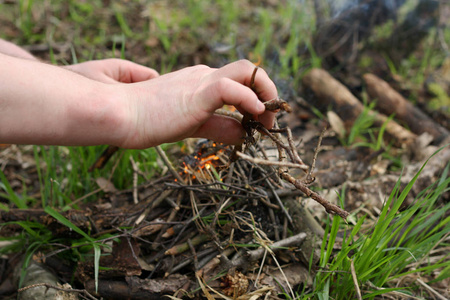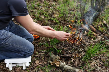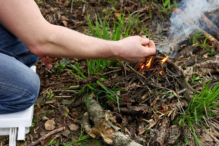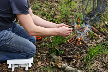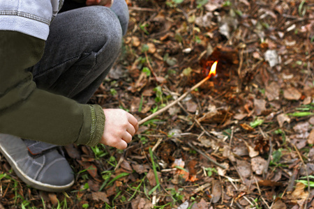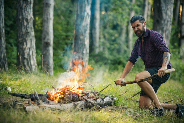 穿格子衬衫的男孩在秋天的森林里生火插画