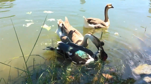 鸭老公把鸭老婆的头硬往水里啄,大鹅都看
