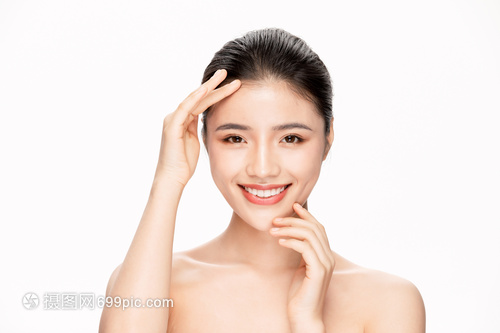 女人的脸部皮肤护理。美丽的微笑女性面部