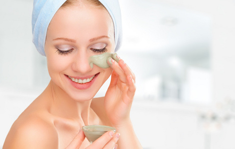 美丽的女孩在浴室和掩码为面部皮肤护理