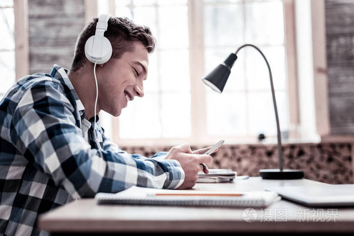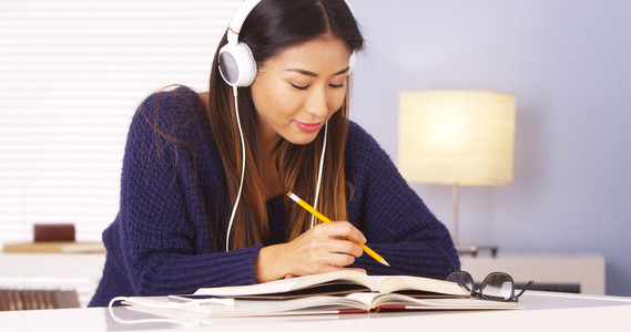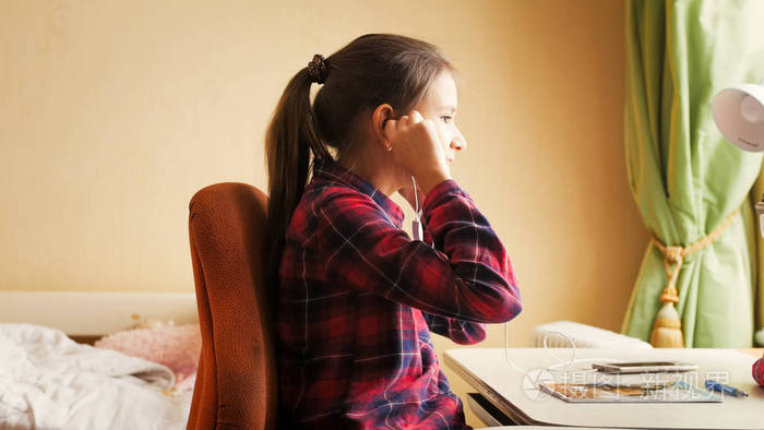 在做作业时用耳机听音乐的十几岁女孩的肖像