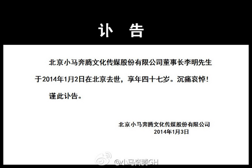 小马奔腾发讣告:沉重哀悼董事长李明去世(