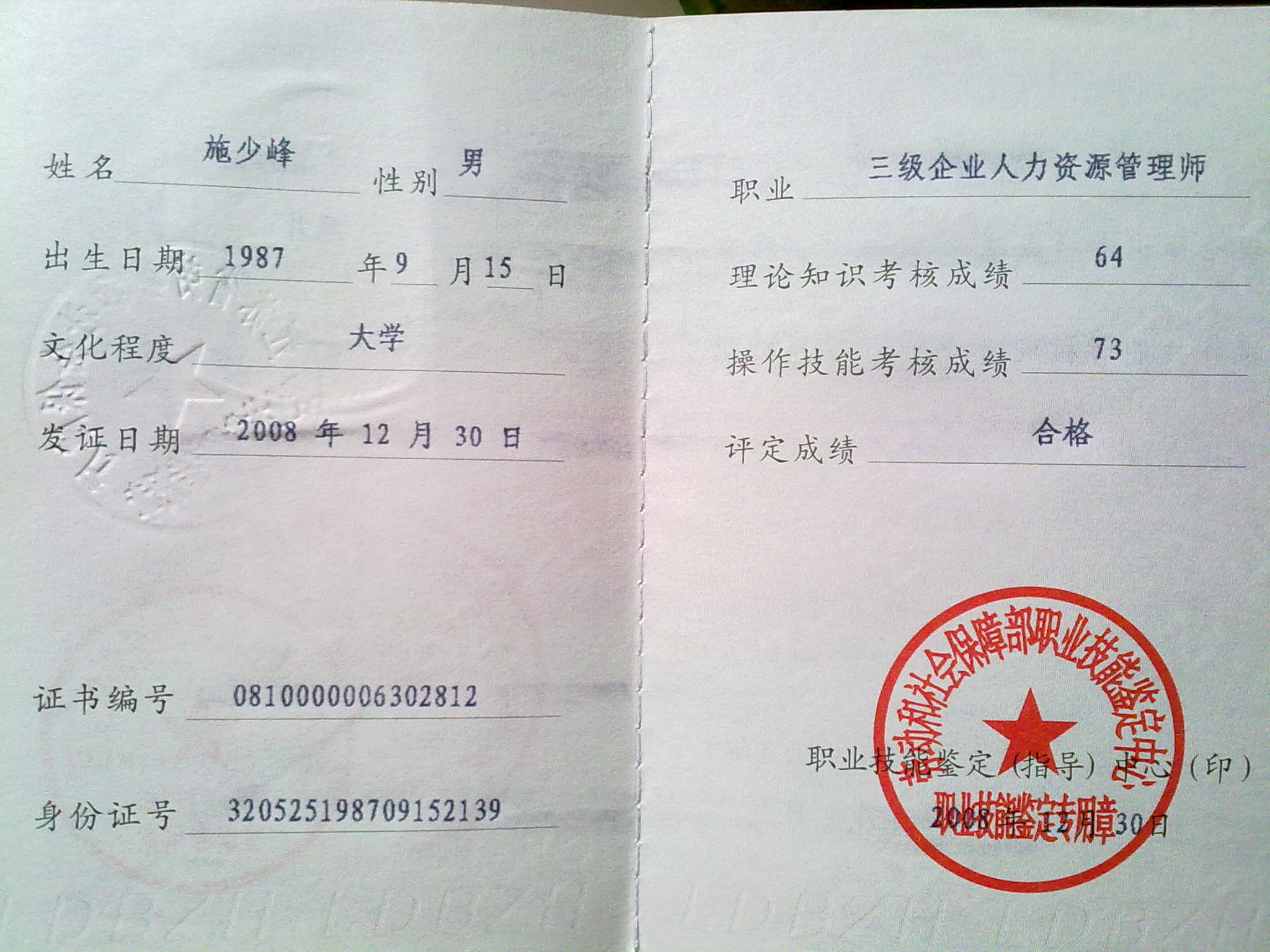 企业人力资源管理师合格证书样本-人力
