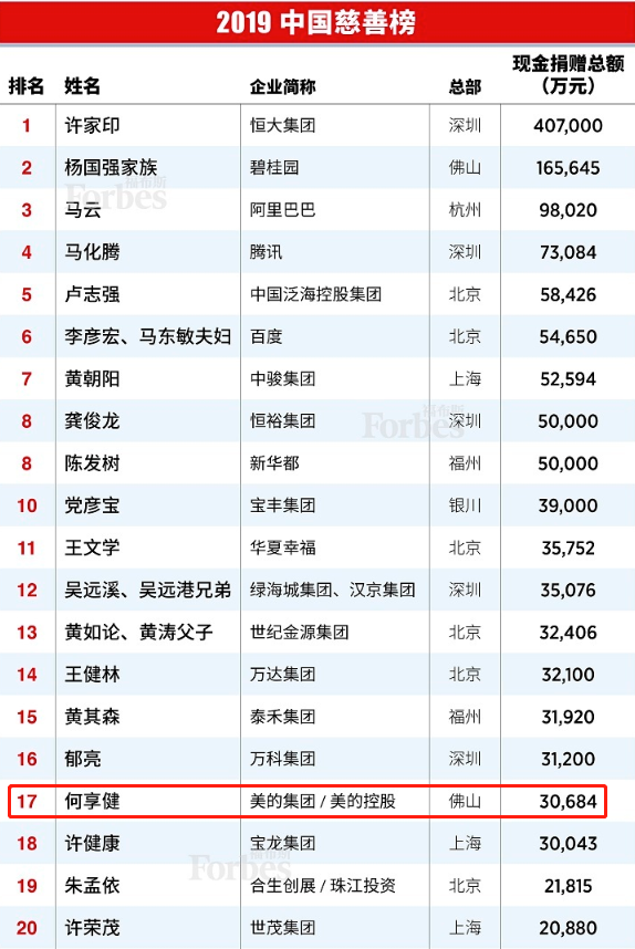2017胡润慈善榜:徐冠巨及其家族成中国首善