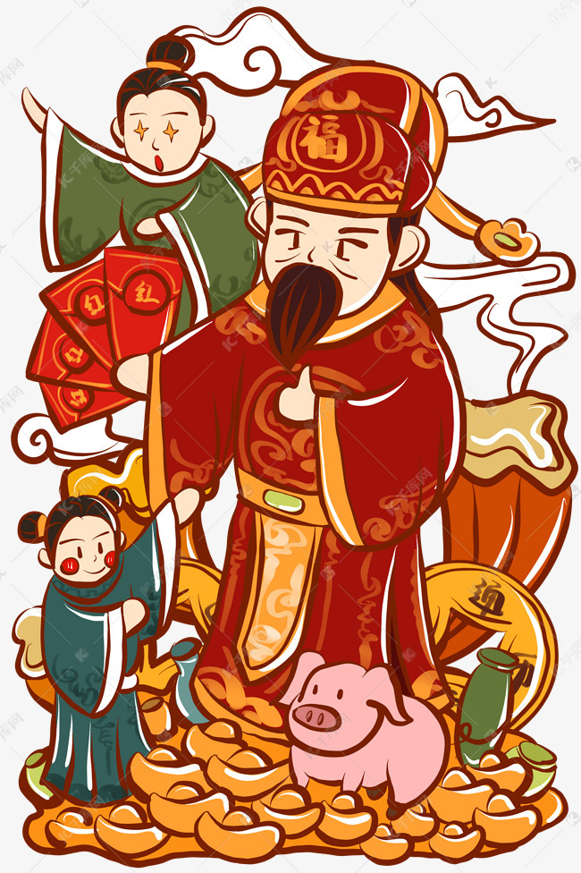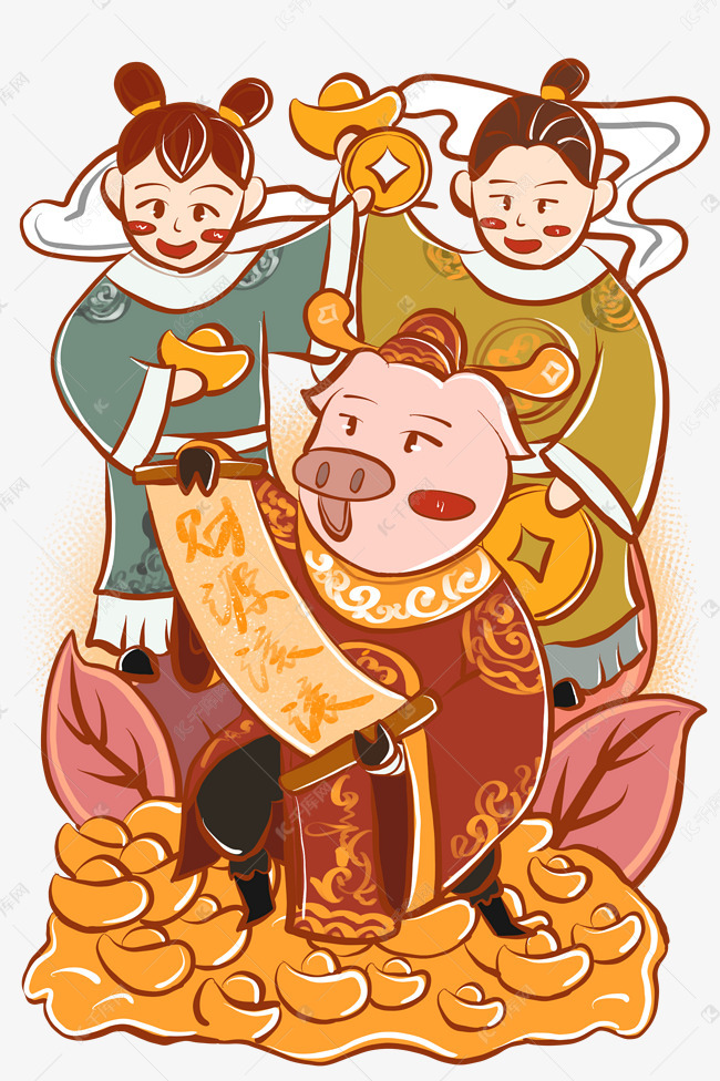手绘卡通猪年财神猪送财童子图素材图片免费下载_高清psd