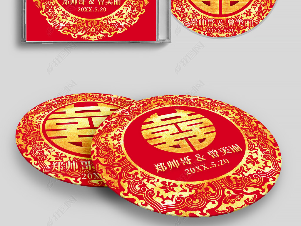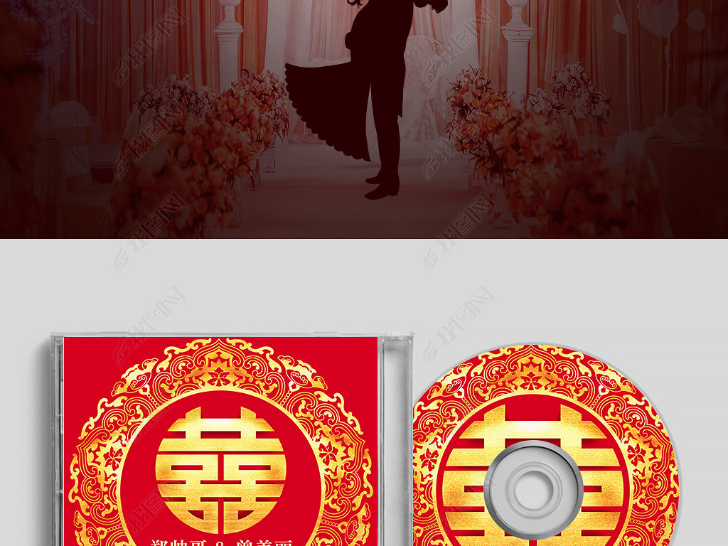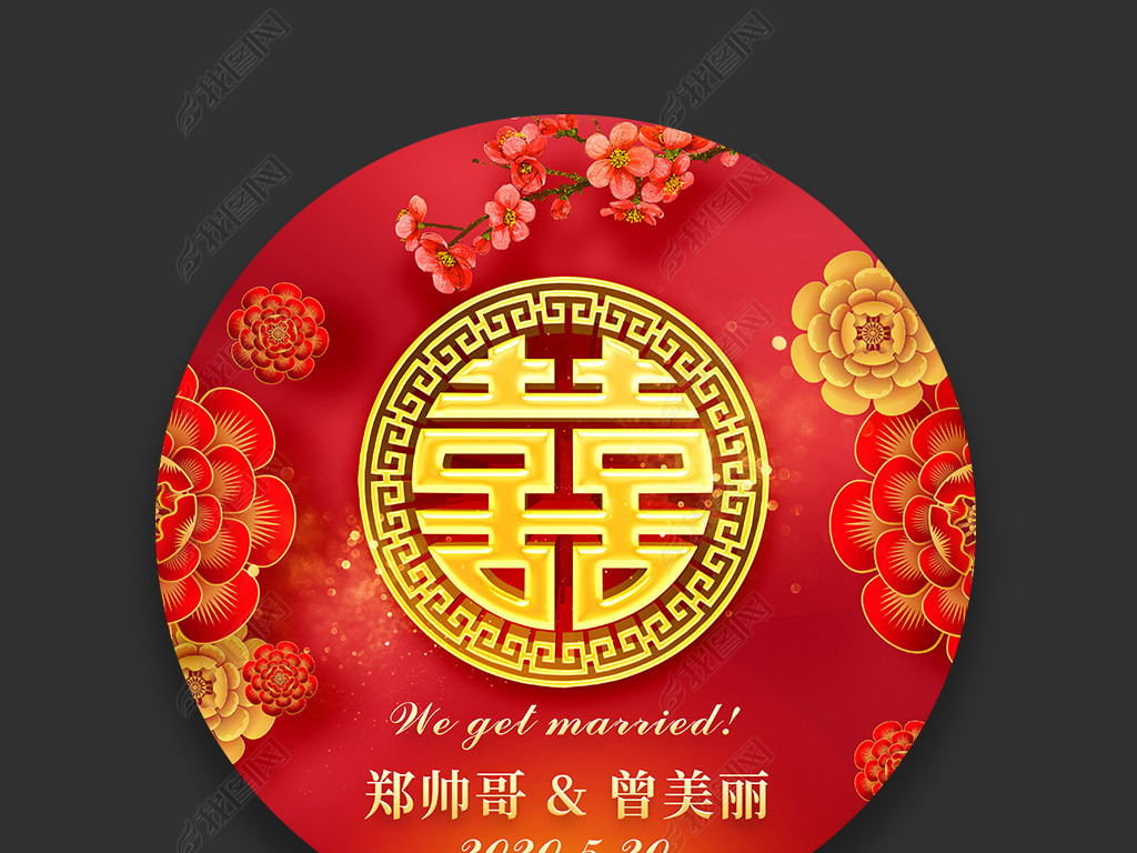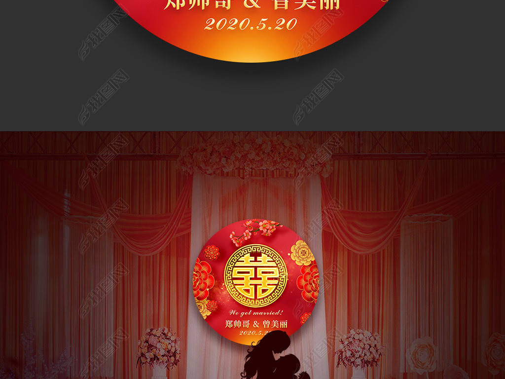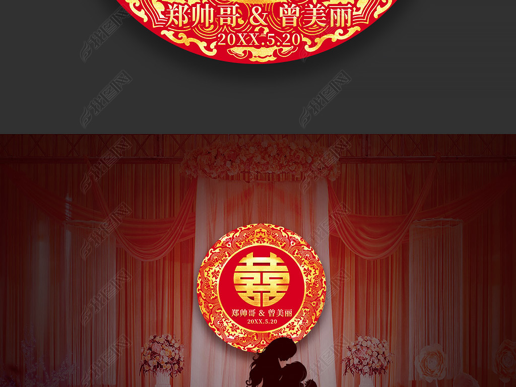 红色喜庆新中式婚礼舞台幕布名字挂牌设计图