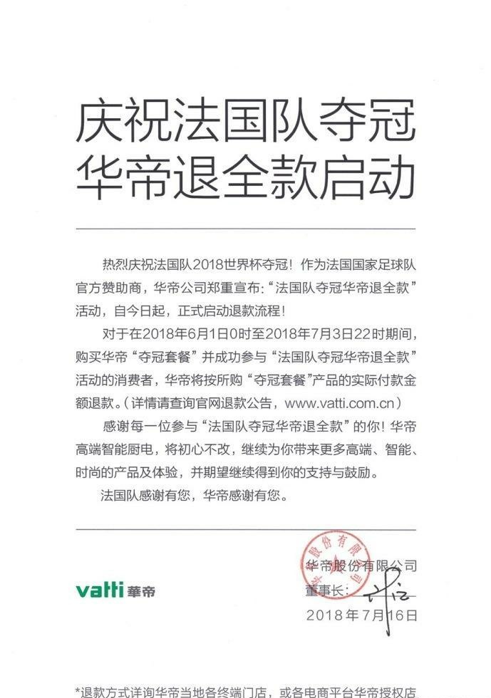 庆祝法国队夺冠!华帝启动退全款 怎么退?
