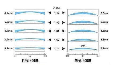 折射率越高,镜片越薄,即镜片中心厚度相同,相同度数同种材料,折射率高的比折射率低的镜片边缘更薄。