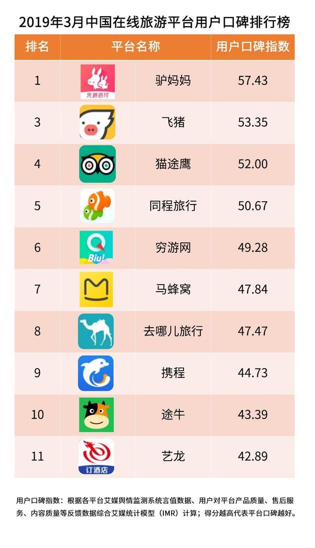 3月中国在线旅游平台用户口碑排行:驴妈妈