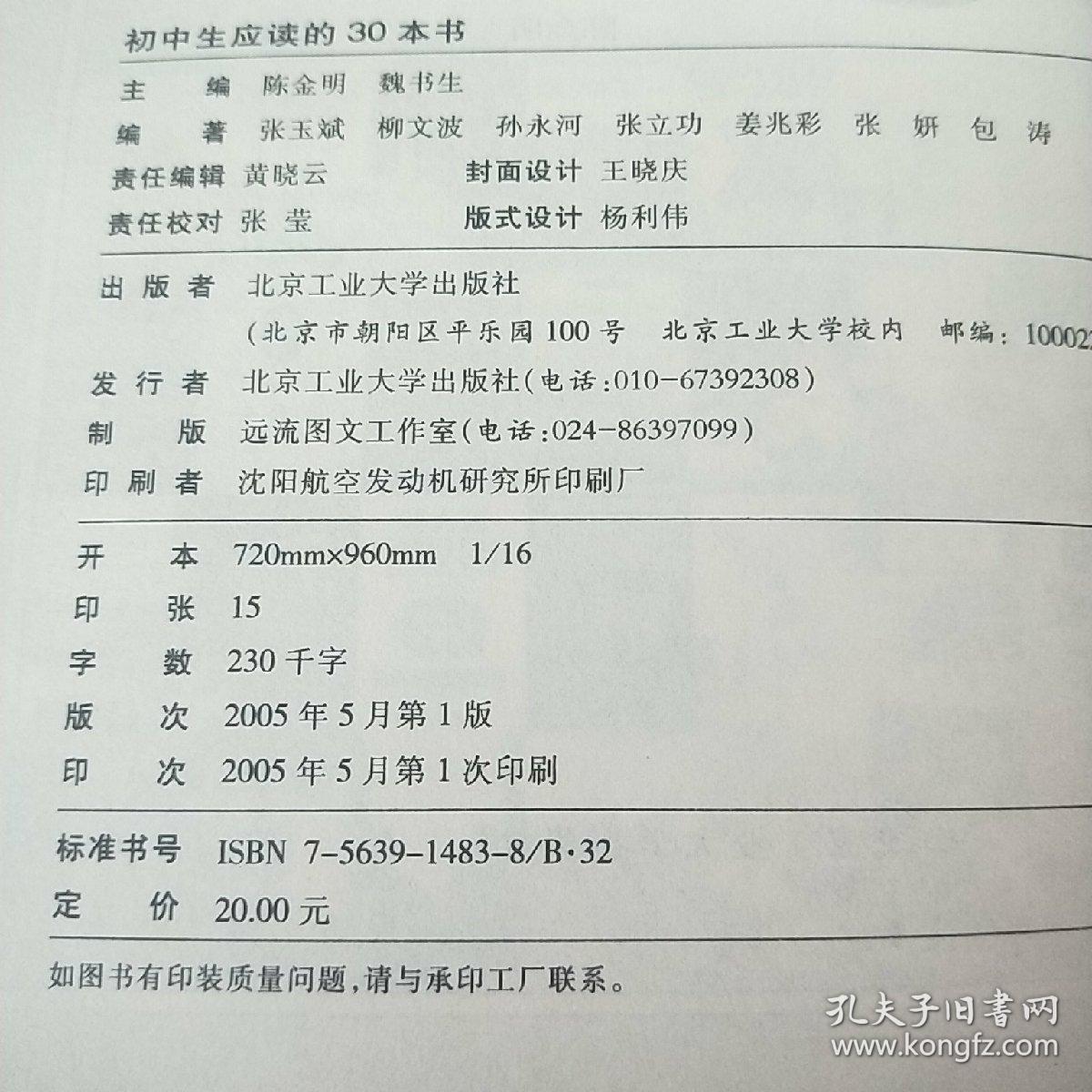 简介:《初中生应读的30本书》是2005年5月北京工业大学出版社出版的图书,作者是张玉斌。该书收录了涉及文学、艺