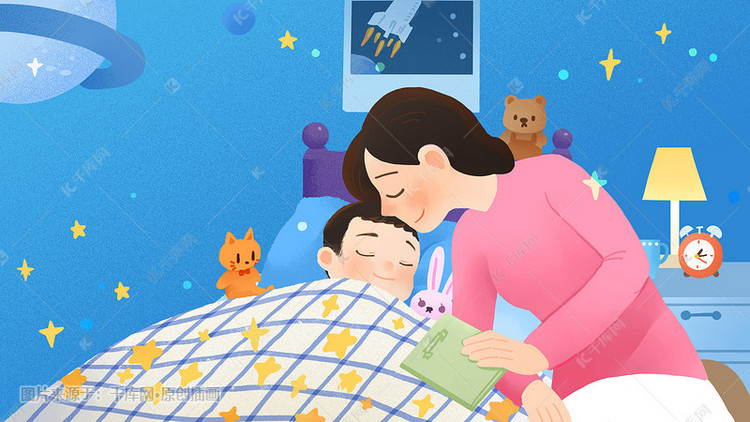 晚安你好家庭温馨母亲哄孩子睡觉插画图片