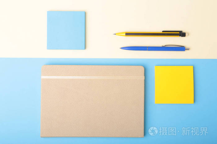 商务办公用的笔记本、钢笔、铅笔等用品。
