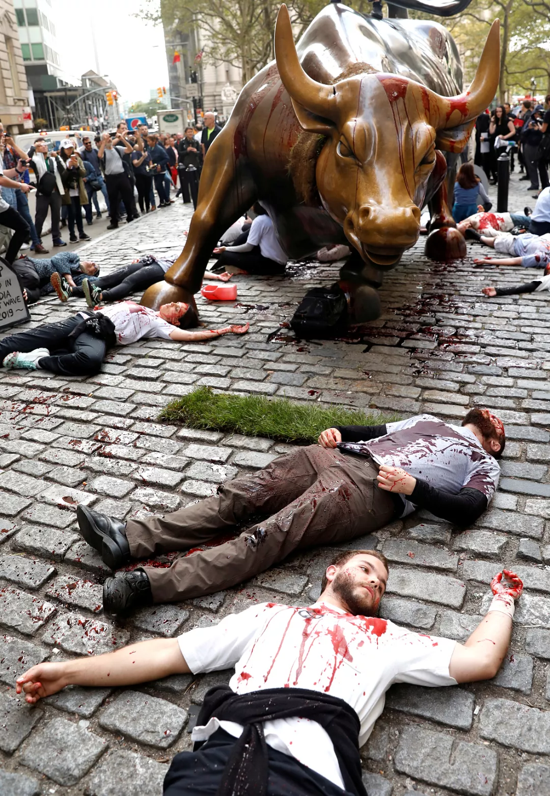 美国:纽约地标华尔街铜牛光天化日被砸 ,引游客围观合照