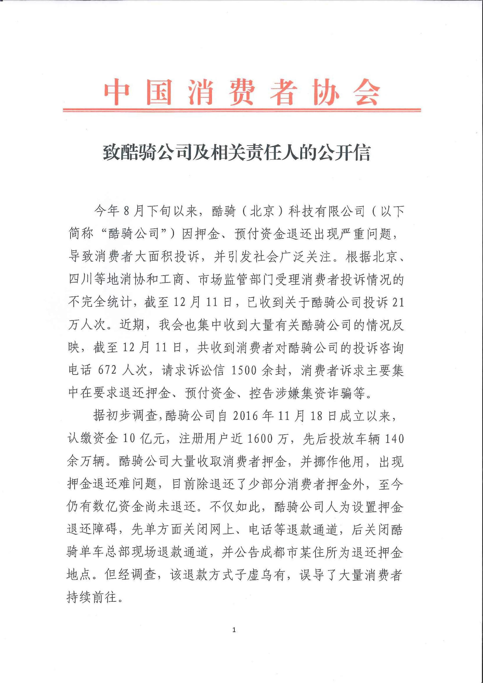 中消协致酷骑公司公开信:强烈谴责 要求致歉|中消协|押金|中国消费者协会_新浪新闻
