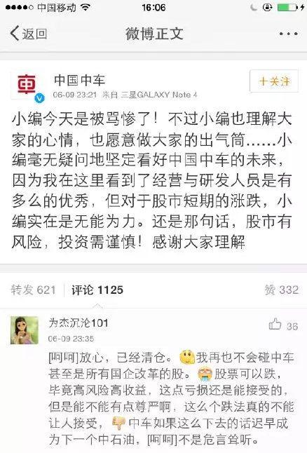 中车暴跌股民要跳楼 官微称愿做大家出气筒