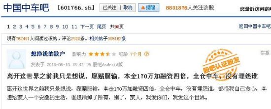 股民170万融资四倍全仓中车 赔光后跳楼