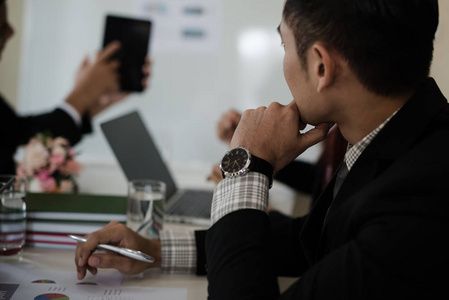 亚洲商人的商业思维。在会议室里一起讨论报告、销售、营销、概念