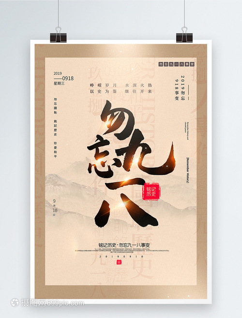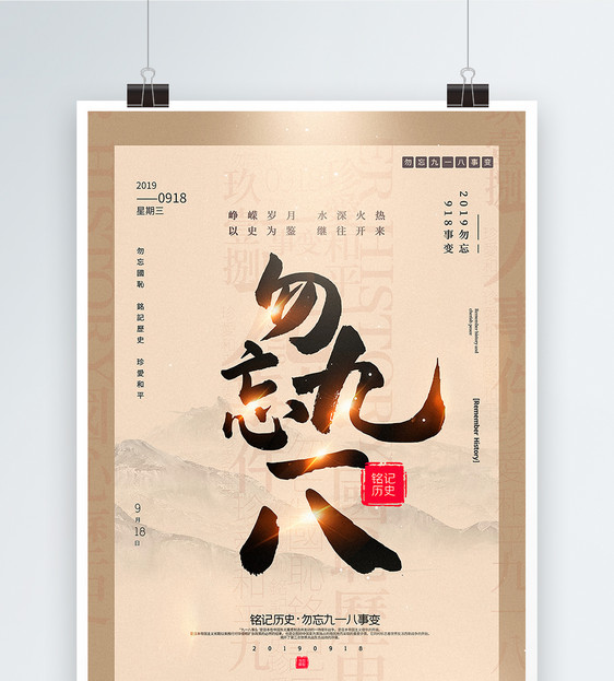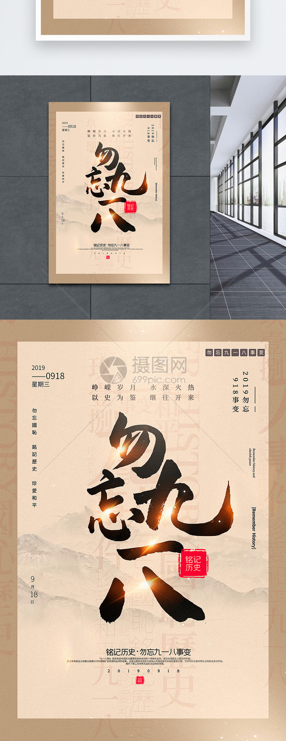 米色拼色勿忘九一八中英文海报