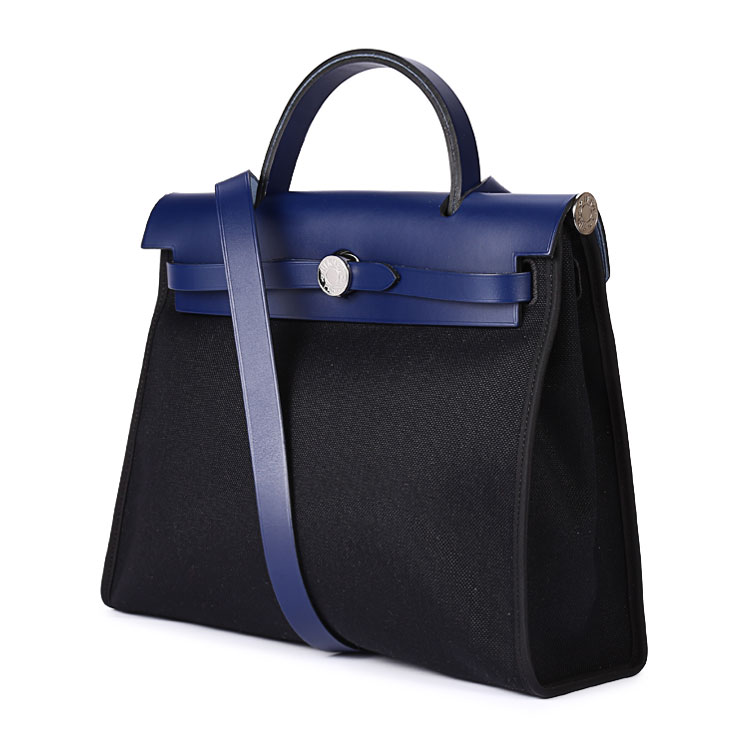 HERMES(爱马仕) 黑色帆布蓝色配皮Herbag 31两用包