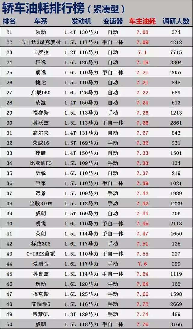 “最省油”的50款轿车油耗排行榜,你的爱车上榜了吗?