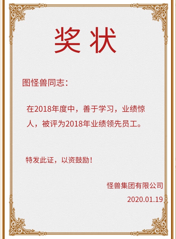 奖状 图怪兽同志: 怪兽集团有限公司 特发此证,以资鼓励! 2018.01.19 在2018年度中,善于学习,业绩惊人,被评为2018年业绩领先员工。 年终奖状印刷海报