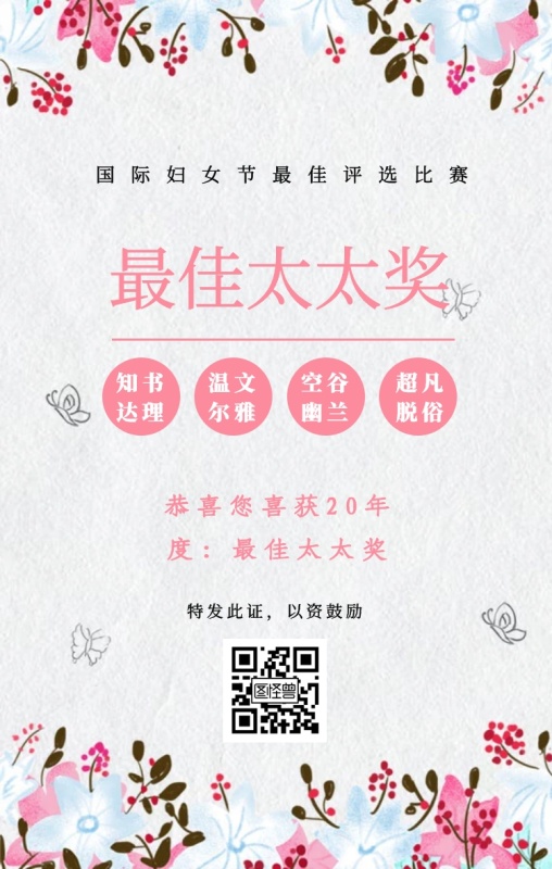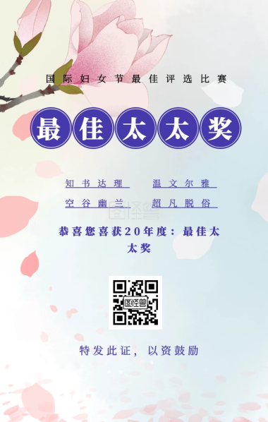 知书达理 温文尔雅 空谷幽兰 超凡脱俗 最佳太太奖 特发此证,以资鼓励 国际妇女节最佳评选比赛 恭喜您喜获19年度:最佳太太奖 妇女节手机海报