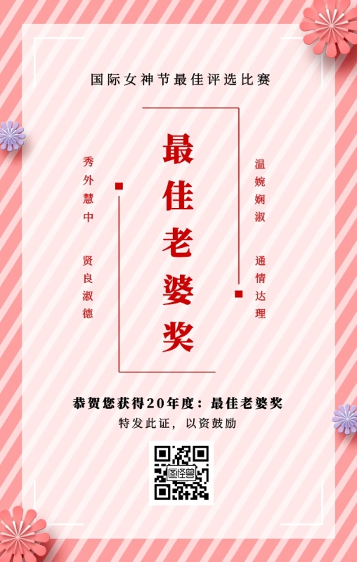 秀外慧中 贤良淑德 温婉娴淑 通情达理 最佳老婆奖 特发此证,以资鼓励 国际女神节最佳评选比赛 恭贺您获得19年度:最佳老婆奖 妇女节手机海报