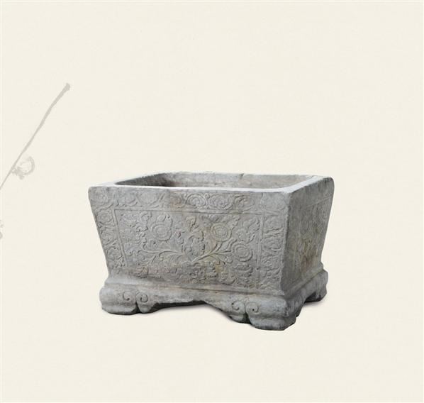 清·青白石四面花卉如意足石盆