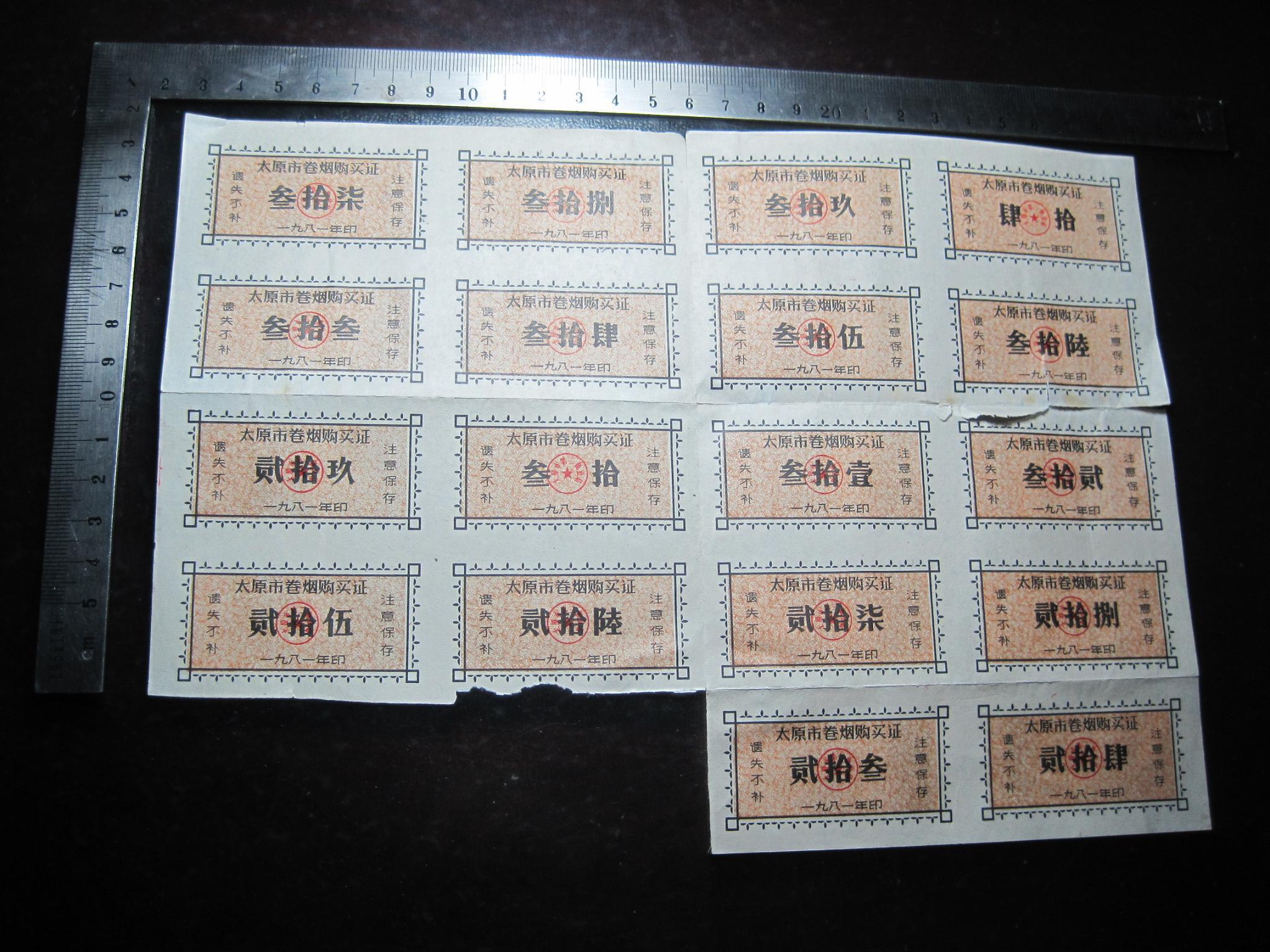 (计划经济时代的老票证)《太原市卷烟购买证》(1981年,一张18枚合售)