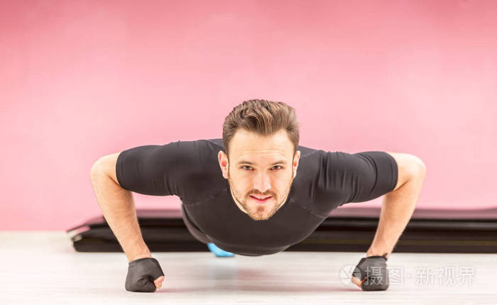 一个年轻英俊的男子肖像在健身房俯卧撑拳头